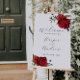 Elegant floral wedding welcome sign featuring watercolor illustration of burgundy and navy peony with greenery. Perfect for a fall or winter wedding.