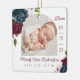 New baby birth stats photo Christmas ornament. The design features two photos, one photo on the front and one on the back. Display your new baby's photo. The date of birth is displayed along the side and the baby's name and birth stats along the bottom. Beautiful bold floral arrangements with deep burgundy, rich navy blue, and blush pink flowers with accents of lush green sage leaves and greenery. Florals are arranged in beautiful bouquet arrangements to create this bold and elegant floral design. Watercolor florals painted by Moodthology.