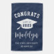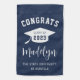 An easy to customize garden flag to celebrate a loved one's graduation, this design features "congrats" across the top in collegiate lettering, curved over a white grad cap illustration with "class of [year]" inscribed inside. Personalize with the graduate's name in handwritten calligraphy script lettering, and add their school name beneath, on a navy blue background. Design repeats on reverse side.