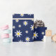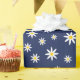 A pattern of white daisy flowers with yellow middles on navy blue.