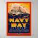 Vintage bright design showing a military ship cutting through the waves. "Navy Day" below in gold. Colors are an orange red and blue.