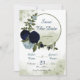 beautiful romantic navy and dusty blue flowers and green leaves botanical greenery wreath save the date invitation
