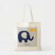 A cute elephant design tote bags sure to please both kids and adults who love elephants, features a cute navy blue elephant with gray chevron striped ears and a yellow polka dotted umbrella on an gray and white zig-zag striped background.