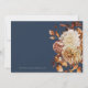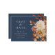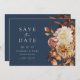 Navy Fall Save the Date. This elegant wedding program hand fan features hand-painted watercolor burnt orange and terracotta leaves, cream and beige dahlias, and beautiful rust-colored roses on a navy background. The back includes a matching floral and leaf bouquet with more text to personalize. Find matching items in the Navy Blue Autumn Romance Collection.
