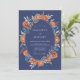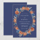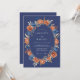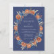 This design features a rich navy background adorned with a painterly floral arrangement in warm coral and deep blue hues. Delicate leaves and blossoms create a romantic and artistic composition, evoking a sophisticated, autumnal atmosphere.