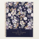 Elegant navy blue floral gold monogram planner special edition with a bold botanical design in soft gold and lavender tones. Featuring a chic gold monogram and personalized name on the cover, this spiral planner is perfect for daily planning, journaling, or note taking. A timeless and stylish stationery piece that makes a beautiful gift for women and girls who love modern floral design.