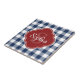 A trendy navy blue and white gingham pattern background with a Moroccan quatrefoil label frame on top featuring a customizable name / monogram initial letter template.