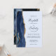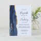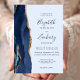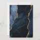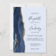 The left-hand edge of this elegant modern wedding invitation features a navy blue watercolor agate border trimmed with faux gold glitter. The customizable text combines handwriting, copperplate and italic fonts in dark blue on a pale blue background. The reverse side features a matching navy blue and gold agate design.