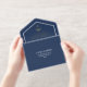 Elegant nautical themed all in one wedding invitation in navy blue with white rope frames and a gold foil anchor and elegant fonts printed in gold foil for a nautical wedding.