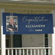This Class of 2026 stylish graduation party banner features gold stripes and frame around the graduate's photo and a navy blue background.