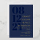Elegant typography wedding invitation in navy blue with your wedding date in large dark blue numbers down the side of the invitation. Add names and wedding wording in gold foil. Gold foil and dark blue wedding invitation with your names in a large font. Double sided wedding invitation with your invitation in gold foil on one side, and your wedding details printed with a tan color on navy blue on the other side.