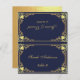 A vintage navy and gold wedding place card with the guest name and the table number printed on its front and the bride and groom names and the wedding date printed on the other side (that is the other half, before folding it). It has an antique frame with faux silver foil decorations and also faux silver inside (on the back, before folding it). All text is golden, written in elegant calligraphy. The background is navy blue.