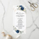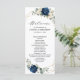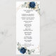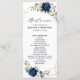 Dark navy blue floral wedding program card featuring elegant bouquet of navy blue, royal blue , white , gold, champagne ivory, blush color rose , hydrangea, ranunculus, peony, flower buds and sage green eucalyptus leaves and elegant watercolor with round glitter geometric neutral frame. Please contact me for any help in customization or if you need any other product with this design.