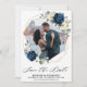 Dark navy blue floral save the date card featuring elegant bouquet of navy blue, royal blue , white , gold, champagne ivory, blush color rose , hydrangea, ranunculus, peony, flower buds and sage green eucalyptus leaves and elegant watercolor with round glitter geometric neutral frame. Please contact me for any help in customization or if you need any other product with this design.