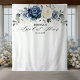 Dusty blue floral bridal shower photo backdrop / photo booth prop featuring elegant bouquet of navy blue, royal blue , white , gold, champagne ivory, blush color rose , ranunculus flower buds and sage green eucalyptus leaves and elegant watercolor bouquet. Please contact me for any help in customization or if you need any other product with this design.
