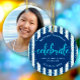 This personalized photo ornament is a wonderful keepsake for your favorite grad or her family members. The front boasts stunning, modern, sparkly faux turquoise glitter handwritten script calligraphy on a navy blue and white striped background with faux turquoise glitter confetti dots. Personalize the custom text with your grad’s name, high school, and class year. Her custom photo is on the back. Choice of ceramic, metal, glass or premium metal frame materials and a circle or square shape. Matching invites, thank you cards, cap toppers, napkins, plates and other graduation goodies are also available in this trendy and stylish collection. Guaranteed to preserve cherished memories of her special occasion!