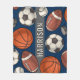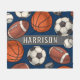 An action-packed fleece blanket featuring a hand-drawn pattern of footballs, basketballs, soccer balls, baseballs, and hockey pucks with a custom name displayed on a bold gray banner. The classic navy background gives the design a timeless, athletic feel. An ideal gift for young athletes, sports fans, or anyone who can never pick just one favorite sport. The name text is fully customizable.
