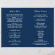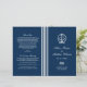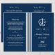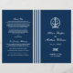 A white anchor and rope monogram stands out against a rich navy background on this striking nautical ceremony program. Classic navy and white racing stripes accent the spine, while elegant script presents your names in crisp white below the anchor crest. A decorative sailors knot adds an authentic maritime detail. Inside pages are fully customizable for your bridal party, ceremony order, and a personal thank you message on the back cover. Programs are printed on text-weight paper and arrive flat, requiring a simple center fold.