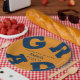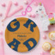GRAD in bold navy blue lettering curves around the edges of these light orange graduation party paper plates - available in 2 sizes. Congratulations above the name of your graduate and the Class of below. The perfect addition to your table decor for upcoming grad parties. **TIP: Click on CUSTOMIZE button; click on COLOR box on top right; enter your color hex code in the #xxxxxx box to match your school colors. SEE ENTIRE COLLECTION of pre-done color combinations and more in our store.