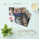 Navy blue double sided flyer for a professional photographer, where you can showcase your work in a photo collage with room for six of your photos. Add your name and specialty or title or service on the cover. The back features faux gold confetti, a profile photo of yourself, and your contact information in white against a dark blue background.