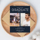 Celebrate his graduation with this navy blue two photo collage modern graduation announcement card. Customize with two of his senior photos, name and the name of his school. Additional information can be added to the bottom of the announcement such as the graduate's college plans or party invitation details. This class of 2021 graduation announcement card reverses to a coordinating blue on the back.