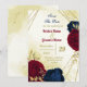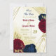 Beautiful wedding save the date card featuring dark navy blue and red flowers and gold leaves .