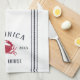Customize your shore house or beach house kitchen with this cute personalized towel featuring your family name or house name and year established in rich navy blue lettering accented with a red crab.