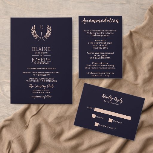 Navy Rose Gold Monogram Wedding InvitationsDesigned by Maria G