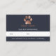 Stylish appointment cards for pet salons, groomers or dog walkers. Personalise with your initials or business name under a faux rose gold foil paw print logo on a rich navy blue background. Edit your cancellation policy and add your name or business name and contact details to the reverse.