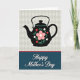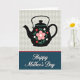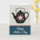 This card shows a black teapot silhouette centered on a pale gray background with a subtle diamond pattern, giving the scene a cozy, tea-time charm ❤️. Across the teapot’s rounded body sits a large blush-pink flower with a white center, surrounded by smaller red and white blooms that feel like a sweet bouquet shared between close friends. Teal-green leaves and curling stems wrap around the flowers, adding a gentle sense of closeness, like arms loosely linked. A thin red line with a slim white line beneath it separates the top illustration from the lower section. The bottom half is a wide navy panel where the words “Happy Mother’s Day” appear in flowing white lettering, centered and easy to read. The contrast between the dark teapot, soft background, and deep blue base keeps the layout balanced while the floral details add warmth 🌼. The pale gray top field shows a faint harlequin-style pattern behind the teapot, and the navy panel below looks smooth and solid.