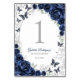 Navy silver Quinceanera celebration table number cards. Features, script font, silver butterflies, watercolor roses and tiara. Perfect for an elegant princess style glam celebration. Personalize with your own details. Printed Zazzle invitations or instant download digital printable template.