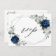 Dark navy blue floral wedding RSVP postcard featuring elegant bouquet of navy blue, royal blue , white , silver, champagne ivory, blush color rose , hydrangea, ranunculus, peony, flower buds and sage green eucalyptus leaves and elegant watercolor with round glitter geometric neutral frame. Please contact me for any help in customization or if you need any other product with this design.