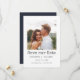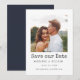 Simple elegant photo save the date featuring your best engagement photo over a white background. Card reverse to a solid Navy blue color fully changeable to fit your wedding or photo color scheme.