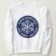 A white snowflake with "Merry Christmas and Happy New Year" on a navy blue circle.