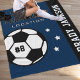 A classic soccer-themed fleece blanket featuring your custom team name, city or location, player's full name running vertically along a black side panel, jersey number on the soccer ball, and star accents. The rich navy blue and black colorway delivers a timeless, polished team look. All text and colors are fully customizable. A perfect gift for soccer players, end-of-season awards, or tournament mementos.