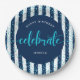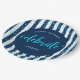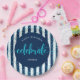 “Happy birthday”. Here’s an unique addition to your birthday fête! “Celebrate” with this stunning, modern, sparkly turquoise glitter dots and typography script against a dark navy blue and white striped background, paper plate for an event to remember. Personalize the custom text with your guest of honor’s name. Your choice of 2 sizes: 7” or 9”. Guaranteed to add stylish fun to her special party! Matching and coordinating invitations, napkins and other birthday goodies are also available in this trendy and special collection.