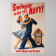 • A charming vintage-style poster featuring a sailor and a woman joyfully swing dancing celebrating classic 1940s Navy spirit.
