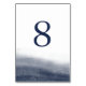 Coastal chic table number cards in shades of deep navy blue and white feature a watercolor wash at the bottom that evokes the ebb and flow of the tide. Design repeats on reverse side. Coordinates with our Navy Tides wedding invitation suite.