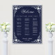 The background is navy blue, all text is light gray. The alphabetical seating chart is for a wedding with navy and silver colors.