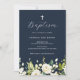 Plain white envelopes are included with paper invitations and will come to fit the invitation size you select. If you don’t need the envelopes, you may choose to not receive them by selecting the dropdown below "Envelopes" and choosing "None." If you’d like to have a design on your envelopes, you can browse all of these available envelopes to find the design that complements your Navy Watercolor Neutral Florals Baptism Invitation.