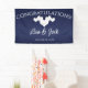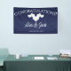 Navy Wedding Banner with Elegant White Hearts. This hanging Wedding Reception Banner is designed with soft white hearts on a navy colored background. The text includes: Congratulations!, The Bride and Groom's First Names and Wedding Date. To personalize, simply insert your details into our easy template, replacing the sample text.