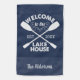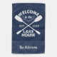 Welcome visitors to your lakeside abode or vacation home with this cute and cheerful flag featuring the phrase "welcome to the lake house" in white lettering on a rich nautical navy blue background accented with oars and rope. Personalize with your family name and year established.