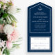 Elegant all in one wedding invitation in navy blue with white rope frames and a white anchor and elegant fonts for a nautical wedding.