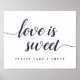 Elegant sign for your wedding dessert table or candy buffet features "Love is sweet, please take a treat" in rich navy blue calligraphy script and classic block lettering.