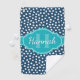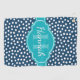 Stylish, trendy dark blue and white dot pattern in the background, topped with a bright teal blue label featuring a customizable name and monogram template.