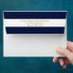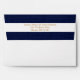 This A7 envelope matches the navy blue and white nautical faux burlap stripe wedding invitation shown below.