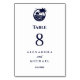 Celebrate your special day with this elegant, personalized coastal wedding table number card, featuring a chic graphic design of a navy blue palm tree, the sun rising above the ocean, and peaceful birds—all surrounded by a navy circle set against a stylish crisp white background. Perfect for a palm tree wedding or beach wedding, this card captures the serene beauty of the sea and tropical summer vibes. The combination of elegant typography and graceful calligraphy script fonts adds a stylish touch to your table number display, making it a perfect fit for any sophisticated seaside celebration.
