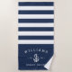 Add a unique custom touch to your beach house with our personalized beach towels. Design features classic nautical navy blue and white stripes with your family name, "beach house" and year established flanking a white nautical rope and anchor illustration.