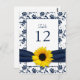 The table number on this sunflower midnight blue or navy marine blue and white damask wedding or special occasion table number card is fully customizable. To change the table number use the personalize option. For these, you must change the table number, change the quantity to 1, and then add it to your cart and repeat the process for all the table cards you need. For more extensive changes to the card including changes to the font, font color, font size, or text placement, use the customize option. This is a sophisticated and elegant table card for a wedding or other special occasion in the summer or fall. Classic navy blue, yellow, and white is always stylish and sophisticated.