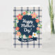 This card features a deep navy circle in the center, framed by a floral wreath that leans in close like a gentle hug ❤️. Inside the circle, a white cursive-style message sits neatly centered, standing out against the dark background with a soft, romantic feel. The wreath is filled with stylized flowers in coral and pale pink, mixed with crisp white blooms, each with bright yellow centers that catch the eye. Curving green leaves and slender tendrils weave between the petals, giving the arrangement a friendly, close-knit look 🌼. Below the circle, a navy ribbon banner stretches across with a smaller white cursive-style line of text, as if addressed to someone special. Behind everything, a plaid pattern of creamy off-white squares is crossed by thin deep navy and lighter blue lines, adding a cozy textile-like backdrop. The overall scene stays evenly lit, with sharp edges on the shapes and smooth color fills that keep the design easy to read. The navy banner has gently pointed ends, and the plaid lines run straight and evenly spaced across the full background.